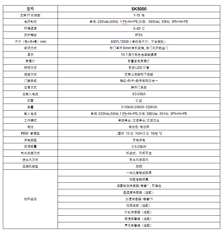 采用SK係列19英寸標準機櫃,櫃(guì)體前門為單開密閉(bì)玻璃門,後門為單開密封鈑金門;配置應(yīng)急通風係統,具有排風功能。櫃體尺寸為600*1200*2000mm(寬*深*高);提(tí)供3kVAUPS不(bú)間斷電源和3.5KW製冷量,係統具備10英寸觸摸屏監控係統,可對櫃內UPS係(xì)統、製冷(lěng)係統、配(pèi)電係統(tǒng)、櫃內溫濕度、以(yǐ)及前後門狀態監測,短信報警功能(選件)。配置機櫃前(qián)後照明(míng),2個溫濕(shī)度傳(chuán)感器,1個煙感,1個水浸,雙色(sè)炫彩燈。